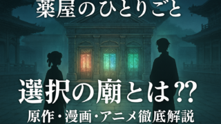 [世界観・名シーン紹介] 薬屋のひとりごと選択の廟とは?原作・漫画・アニメ徹底解説 『薬屋のひとりごと』の中でも、特に注目されているエピソード「選択の廟」。本記事では、「選択の廟」が描かれる原作・漫画・アニメの各媒体における展開をネタバレありで詳しく解説します。 また、「選択の廟」は何巻・何話に収録されているのか、気になる... 2025.04.01 [世界観・名シーン紹介]